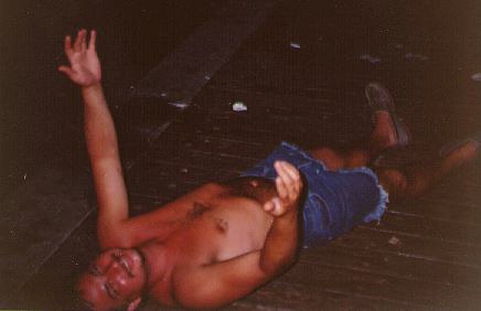 It was quite a late night for all of us that night, but Jamie tired out at the pier before the other three were ready to go, so he did what any crazy person would do, which was lie down in the fish heads, slime, and guts on the pier.