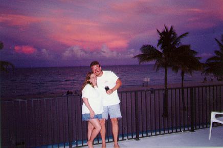 Me and Chris, in front of one of the most gorgeous night skies we've ever seen in our lives. The sun actually rises over the ocean and sets on the other side; this is only the reflection of the sunset on the clouds. Can you believe the color? I had to have this one blown up, and I got a beautiful purple wood frame that makes it look even more unreal!